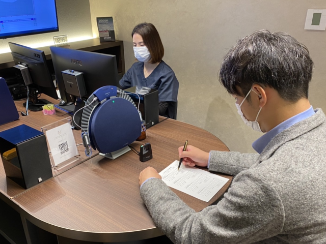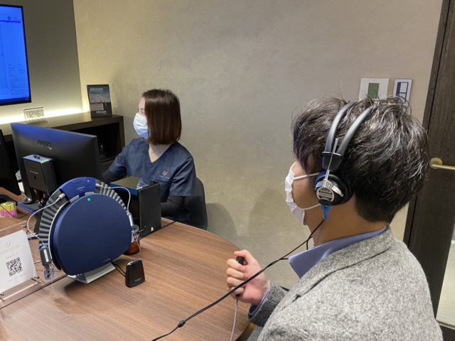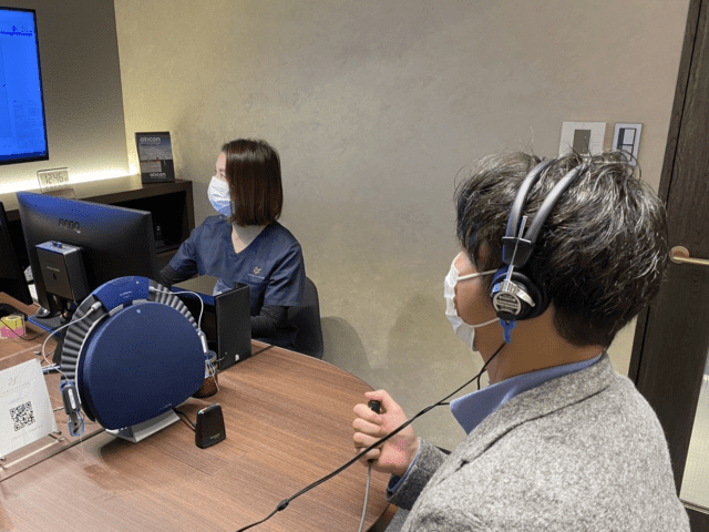 検査室にて標準純音聴力検査・標準語音聴力検査を行います。